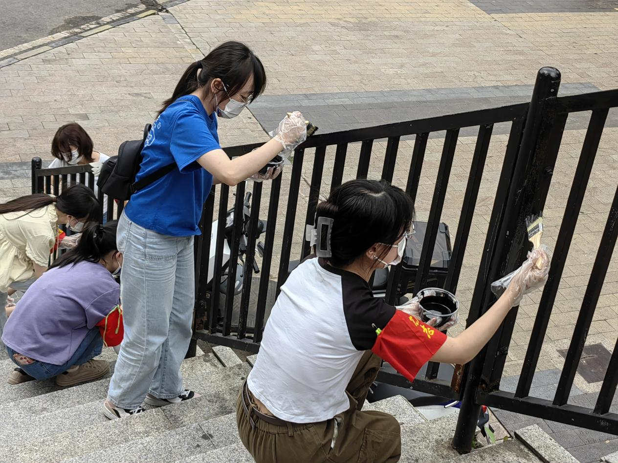 活动当天,同学们抵达龙广居委会,在居委会工作人员的简单培训与分工后,迅速投入到天桥刷漆工作中。尽管刷漆工作需要长时间弯腰、抬手,且油漆气味较浓,但同学们热情不减、积极性高昂。