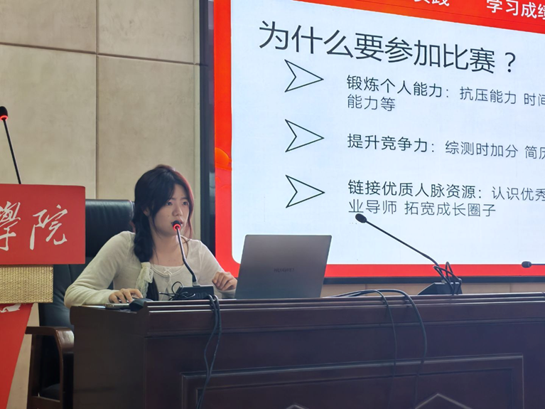 讲座伊始,施辉杰以自身竞赛经历为蓝本,系统梳理了竞赛参与的全流程。针对新生“不知如何入手”的痛点,她详细介绍了竞赛信息获取渠道、组队策略及时间管理技巧。“竞赛不仅是能力的较量,更是资源整合与团队协作的考验。”施辉杰以曾参与的“互联网+”大赛为例,强调“选题要贴近社会需求,团队需明确核心优势”,并鼓励新生“从校级竞赛起步,逐步积累经验”。