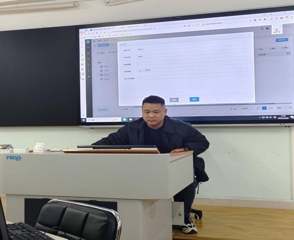 在实操环节,余学丰以建立“学生信息登记表”为例,带领同学们逐步拆解开发流程。从解析表单流程,到入库、演示,再到根据业务规则出库每一个步骤都进行了细致的指导。同学们在实操过程中,亲身体验了低代码开发的高效性,也对平台功能有了更熟练的掌握。