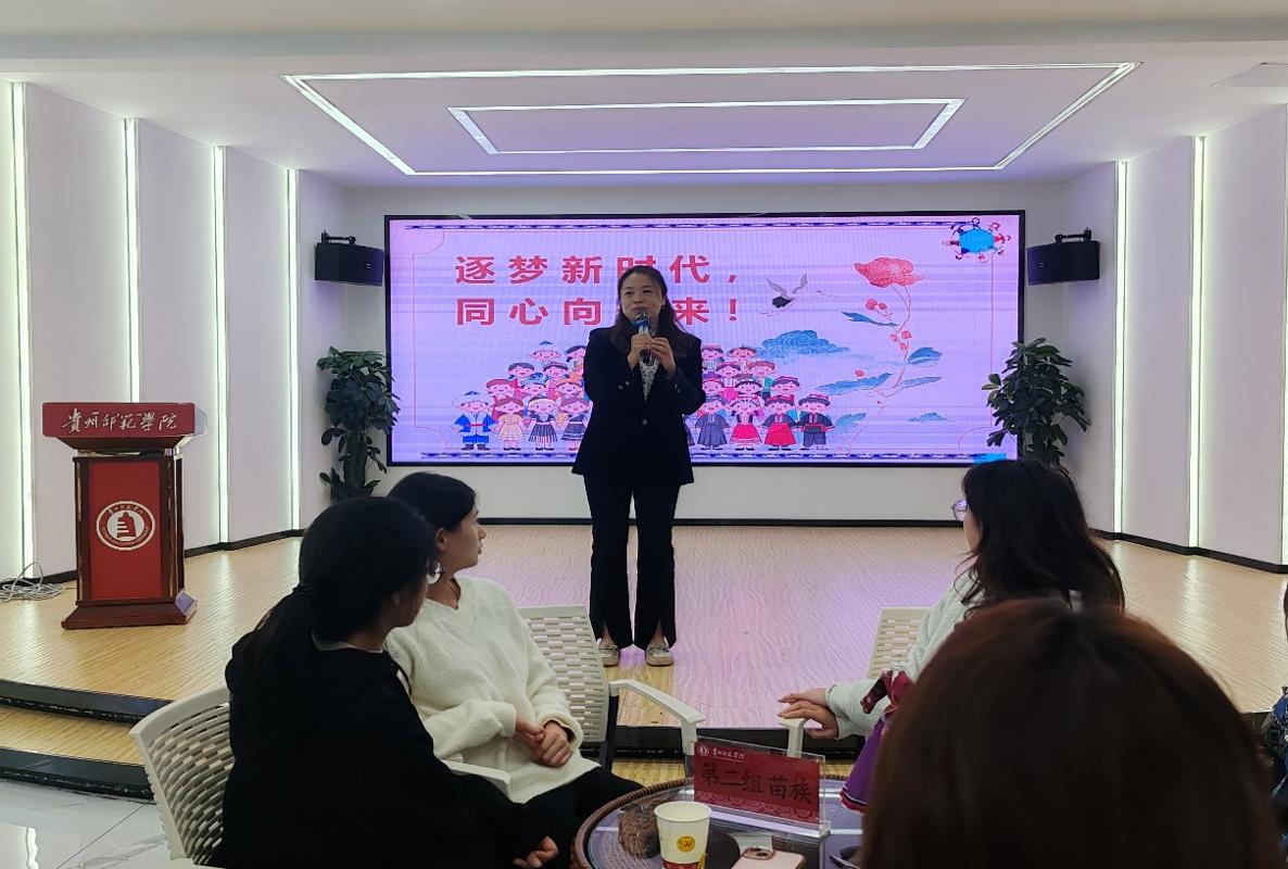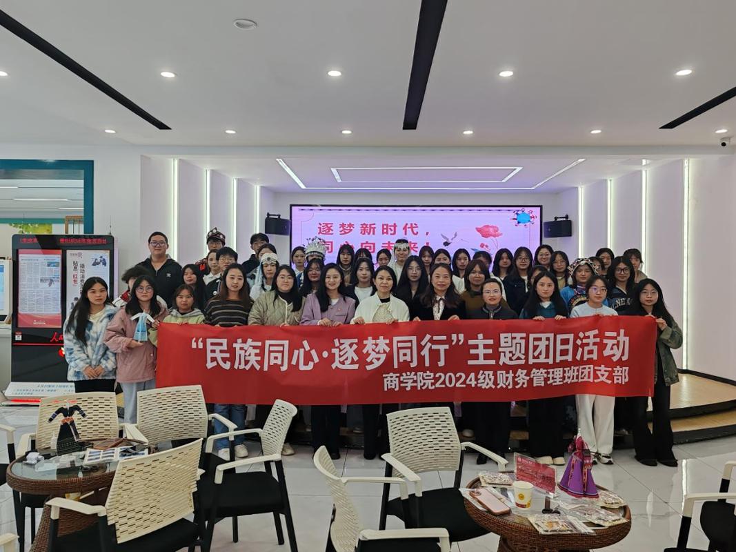 本网讯 民族同心凝青春之力,青年携手赴复兴征程。11月17日,商学院2024级财务管理班团支部成功举办“民族同心,逐梦同行”主题团日活动,校党委常委、宣传部部长宋婷禹,商学院党委书记、院长黄丹、校团委挂职副书记、音乐舞蹈学院团委书记舒然、商学院党委副书记张静、商学院学生第一党支部书记、2024级财务管理班辅导员佘倩、商学院团委书记寇燕受邀出席,与全体同学共赴这场民族文化交融的青春盛会。