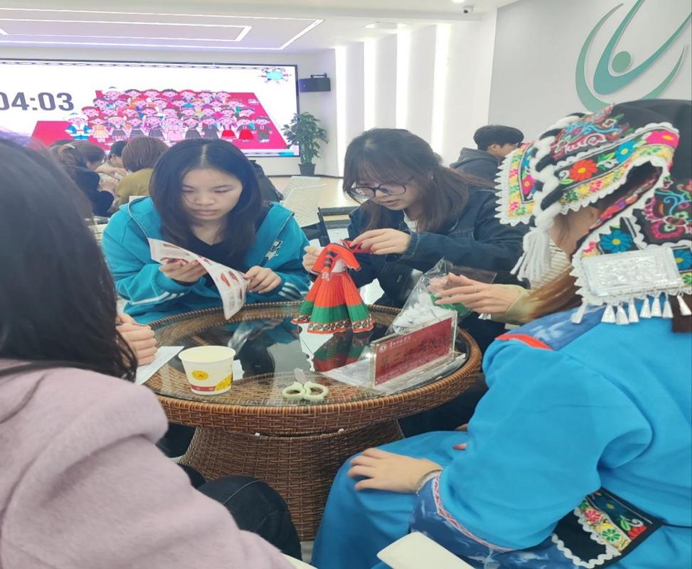 活动以“疆域寻亲”拼图赛拉开序幕,六个小组手持56 个民族特色贴纸,精准地将其对应到中国疆域图的民族分布区域,在分工协作中筑牢“中华民族一家亲”的地理认知根基。随后,“声声不息”歌曲接龙赛点燃激情,8秒接唱的紧张挑战令人心潮澎湃,在歌声中传递民族情谊。“华彩匠心”服饰DIY工坊尽显创意,各小组发挥巧思,利用材料包还原民族服饰经典纹样与配饰,同步完成民族文化主题问题卡作答,打造特色民族服饰,并介绍其文化底蕴。活动在“舞动同心”歌舞联欢中推向高潮,全体师生手拉手围成圆圈,跟随《丽江三部曲》的欢快旋律共跳纳西族传统打跳,用舞步诠释民族团结的深厚情谊。