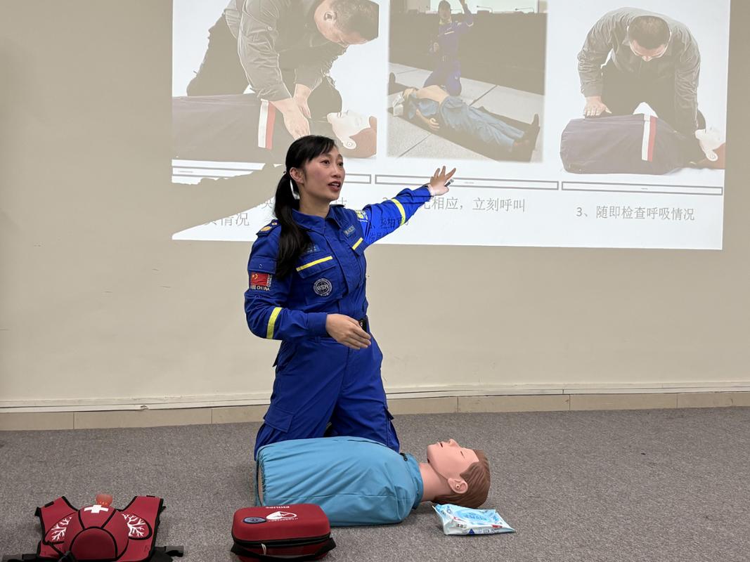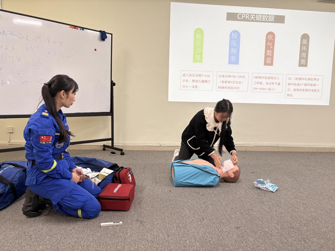 此次培训采用“理论+示范+实操”的模式。胡晓晔首先围绕六大核心应急场景展开详细讲解。从AED设备的操作规范,到气道开放与人工呼吸的关键步骤,到异物卡喉、鼻出血、烧伤、牙齿脱落等常见急创的科学处理方法,再到呼吸问题、过敏反应、晕厥等内科急症的识别与初步处置,内容覆盖日常应急高频场景。在心肺复苏和海姆立克急救法示范环节,胡晓烨与唐亮亲自示范,细致拆解动作要领,重点提醒易错环节,让抽象的应急知识变得通俗易懂。讲解结束后,现场旋即进入心肺复苏考核环节。在两位讲师的细心指导下,同学们依次上场,从胸外按压的深度与频率到人工呼吸的配合节奏,严格按照规范完成操作,充分展现了本次实践教学的良好成效。