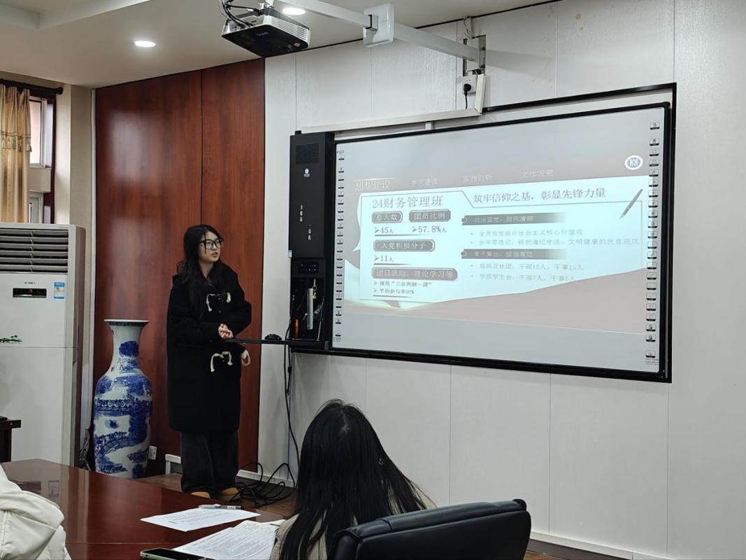 评选环节中,24金融科技团支部任文昱、24财务管理团支部马梦婷分别登台汇报。两人通过图文并茂的PPT,结合详实数据与具体案例,从思想建设、组织动员、学风引领、志愿服务等维度,系统呈现了各支部的特色工作与实践成果。任文昱重点分享了支部将理论学习融入日常,通过主题团日、红色寻访等活动激发团员使命担当的经验;马梦婷则围绕“组织凝聚力量,学风塑造未来”,阐述了支部在强化动员能力、优化学风建设方面的探索与成效。扎实的内容、清晰的逻辑赢得了在场师生的一致认可。