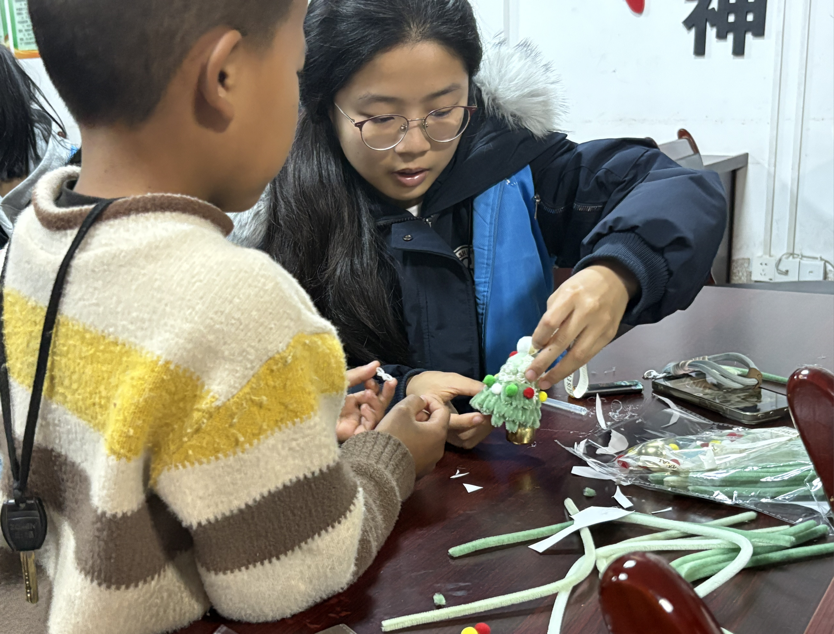 创作环节中,工坊内洋溢着欢声笑语与奇思妙想。孩子们发挥天马行空的想象力,为圣诞树点缀星星与彩球造型的扭扭棒装饰,让成果尽显俏皮灵动。志愿者们穿梭在孩子们中间,或俯身指导造型细节,或帮忙固定松散的接口,或为孩子们的奇思妙想拍手称赞。志愿者在指导孩子们制作挂件的同时,也注意管理剪刀等危险物品,为孩子们的安全保驾护航。孩子们在自主创作中释放天性,在与志愿者的互动中收获信任与友谊。一根根普通的扭扭棒,在童心与创意的碰撞下,蜕变为一件件独一无二的圣诞手作。