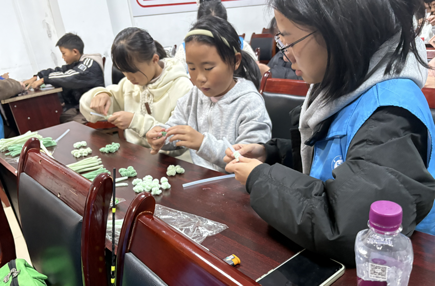 志愿者指导孩子们制作挂件