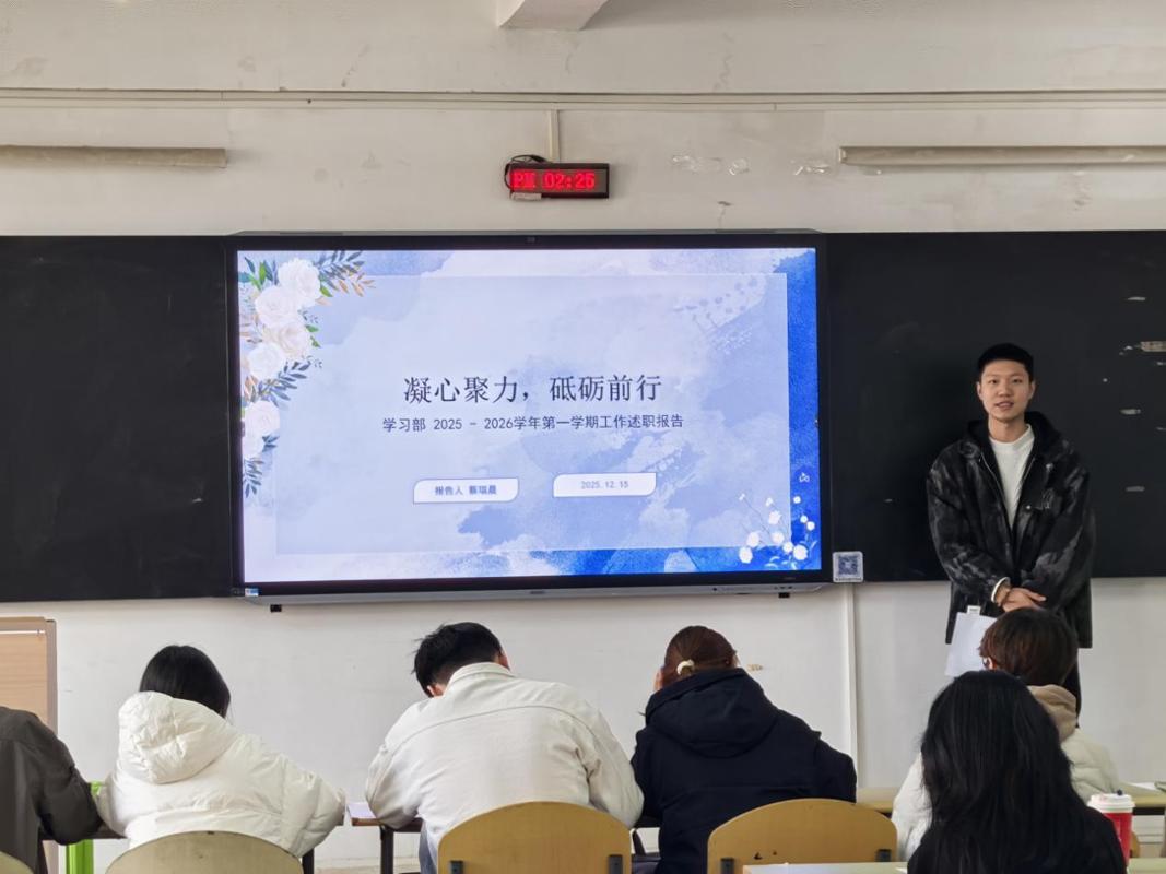 大会伊始,工作人员有序发放部门评议打分名单,明确评议细则。所有参会成员秉持客观公正原则,围绕述职汇报、政治态度、道德品行、工作能力、工作成效、纪律作风六个维度进行量化打分。随后,述职汇报环节正式开启。生纪部、实践部等九个部门代表依次登台发言。各部门代表围绕部门基本情况、学期工作开展、现存问题短板、未来整改方向四个方面展开汇报。发言内容简洁凝练,既有对特色活动的梳理回顾,也有对工作不足的深刻反思,更有对改进措施的清晰规划。