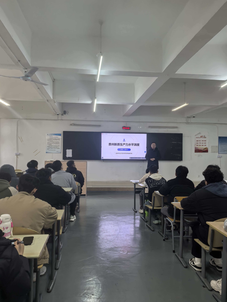 本网讯 12月23日下午,商学院开展科研周系列学术讲座,商学院经济学教授、博士(后)胡江华老师在明德楼518教室举办题为《贵州新质生产力测度》讲座,60多名师名参加学术报告。