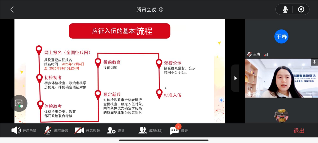 本网讯 为响应国家国防和军队现代化建设号召,落实 “一年两征”工作要求,切实为毕业生搭建应征入伍服务平台,帮助同学们全面了解征兵政策、明晰入伍路径,1月6日,商学院学生第二党支部联合商学院团委在腾讯会议开展2026届毕业生征兵入伍宣讲会。商学院学生第二党支部书记梁敏以“政策解读+实操指导+权益保障”为核心,为全体毕业生送上一堂干货满满的征兵“政策大餐”,用实际行动践行“我为同学做实事”的初心使命。