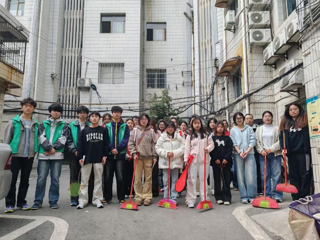 活动当天,商学院学子们身着志愿服装,手持扫帚、夹子、抹布等工具,分组开展社区环境整治工作。在社区街道,大家重点清理路面垃圾、卫生死角及绿化带内的杂物,不放过任何一处细微污渍;在居民楼道,同学们耐心擦拭扶手、清除墙面小广告,规整散落的物品,努力为居民营造干净、整洁、有序的居住环境。
