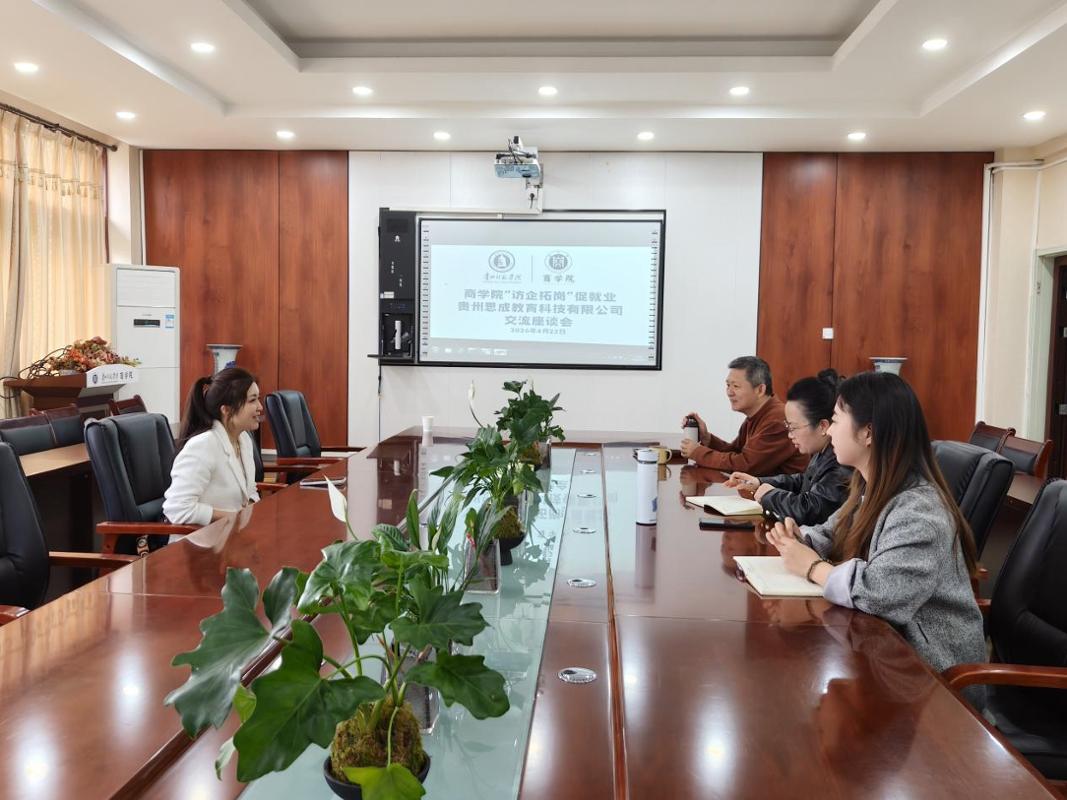 本网讯 为深入贯彻产教融合、校企协同育人理念,精准对接电商行业需求,提升学生实践能力与就业竞争力,商学院与贵州思成教育科技有限公司举行“访企拓岗促就业”交流座谈会。企业人事负责人罗经理、商学院党委副书记张静、副院长谢坚、负责就业工作教师佘倩参加交流会,双方围绕直播电商人才培养、实践平台搭建等议题深入研讨。